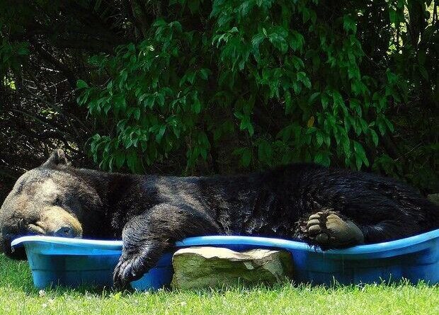 O animal foi encontrado dentro de uma piscina infantil “tirando um cochilo”. A moradora, Regina Keller, acompanhou os movimentos do urso em seu quintal.